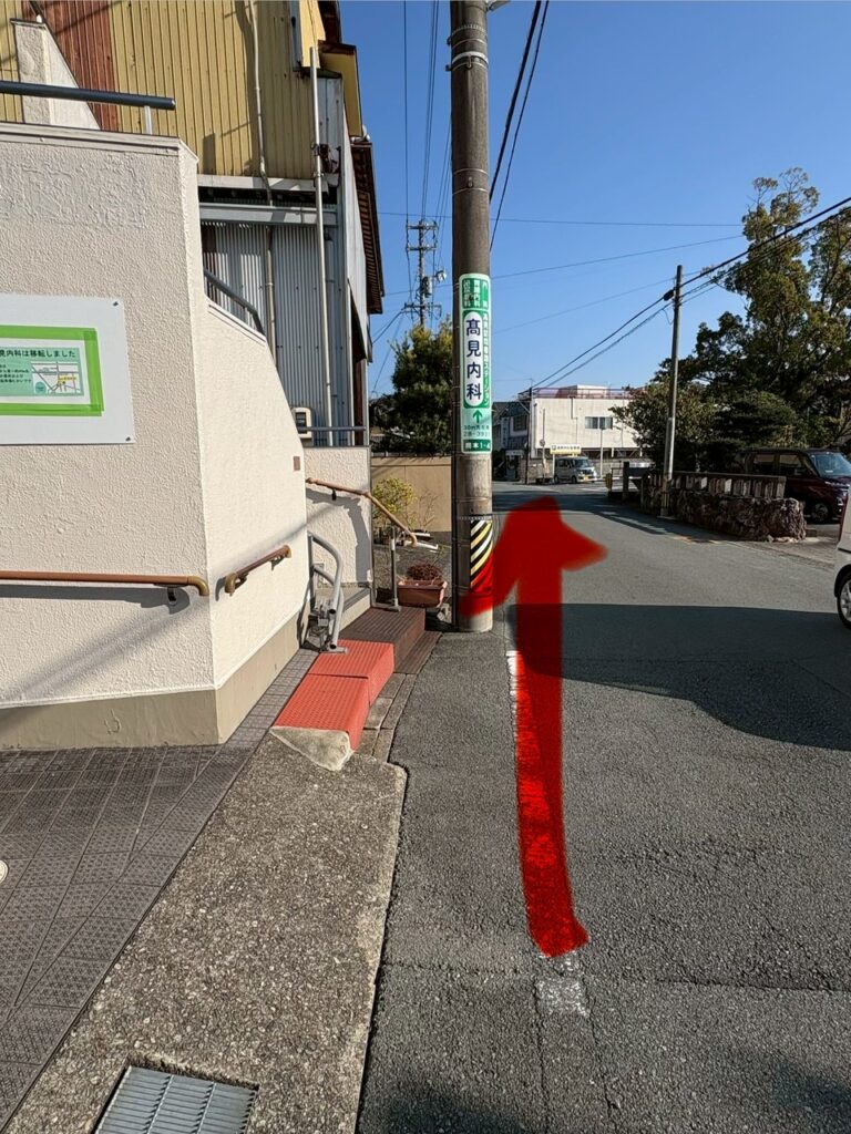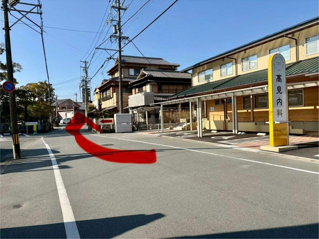 髙見内科 内科付近での工事について 2026.02.14 2/18(水曜)2/19(木曜)に、内科の近くで白線工事が行われる事になりました 市の業務のため詳細な時間や場所はわかっておりませんが、 おそらく、範囲は、旧内科から新内科のあたりまでと思われます(写真の赤矢印のあたり) 車の方も、徒歩の方も、お近くをお通りの際にはご注意をお願いいたします。