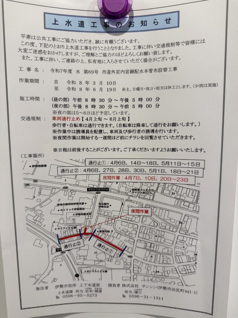 4.5月に伊勢市の上水道工事が行われると案内をいただきました