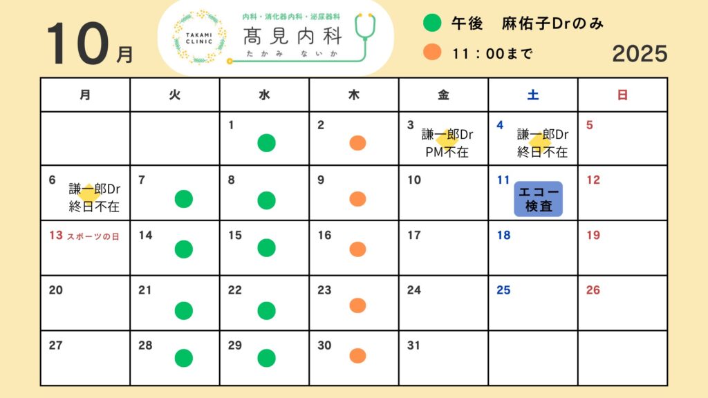 ①大腸カメラの予約を開始しております。検査日は火曜、木曜、土曜ですが、10月の木曜は予約が埋まっております。検査をご希望の方や、検査について質問がある方はスタッフにお声がけください。