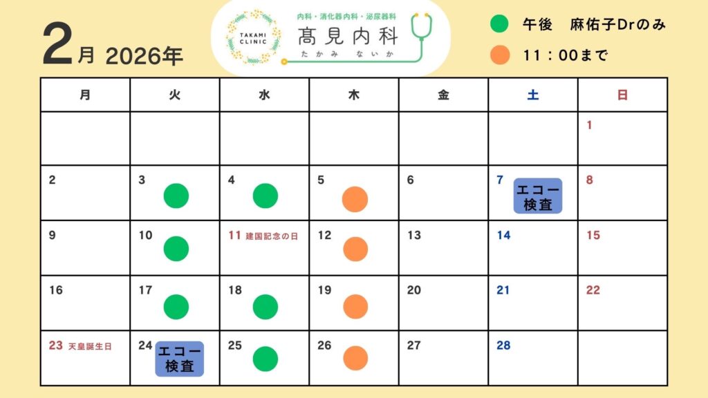 髙見内科 2026年2月診療カレンダー 2026.01.26 髙見内科です、おはようございます 2026/2は今のところ、麻佑子院長・謙一郎先生ともに臨時休診の予定はありません。 ※2026/4より謙一郎先生の診察は、月曜日~土曜日『午前のみ』となります。