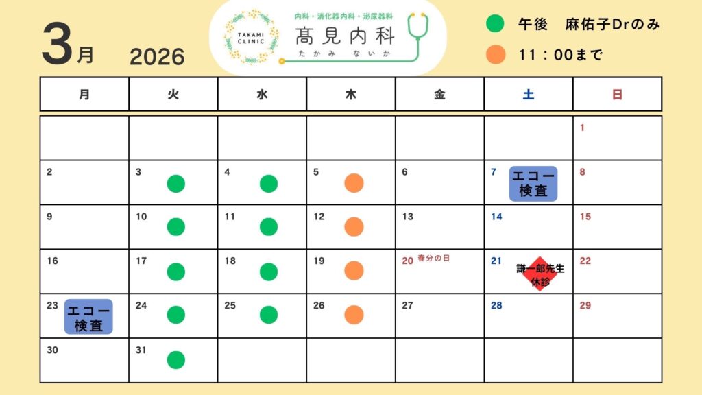 髙見内科 2026年3月診療カレンダー 2026.02.27 髙見内科です 今月は謙一郎先生の臨時休診日があります(麻佑子医師は診療しております) → ◇ 3/21(土曜日)謙一郎先生休診 また、3/4(水曜日)より自動精算機が導入されます。導入当初は現金のみでの対応となります。クレジットカード払いについては、もう少しお待ちください。