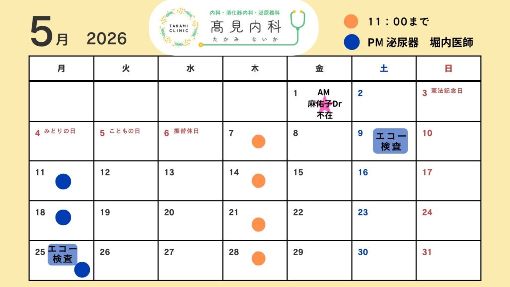 髙見内科です。2026年5月の診療カレンダーになります。