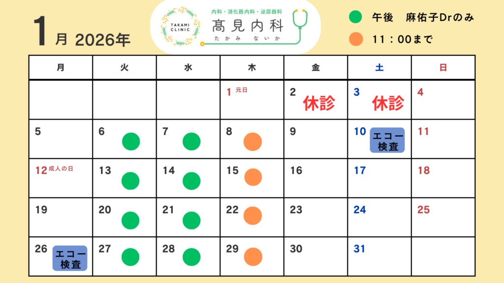 また今月は1/10(土)と1/26(月)が検査技師さんによるエコー日となっております。ご希望の方はスタッフまでお知らせください。